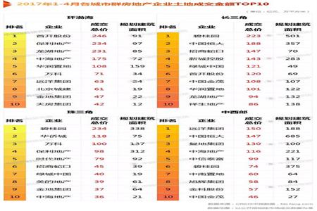 2017年1-4月全国房地产企业拿地排行榜