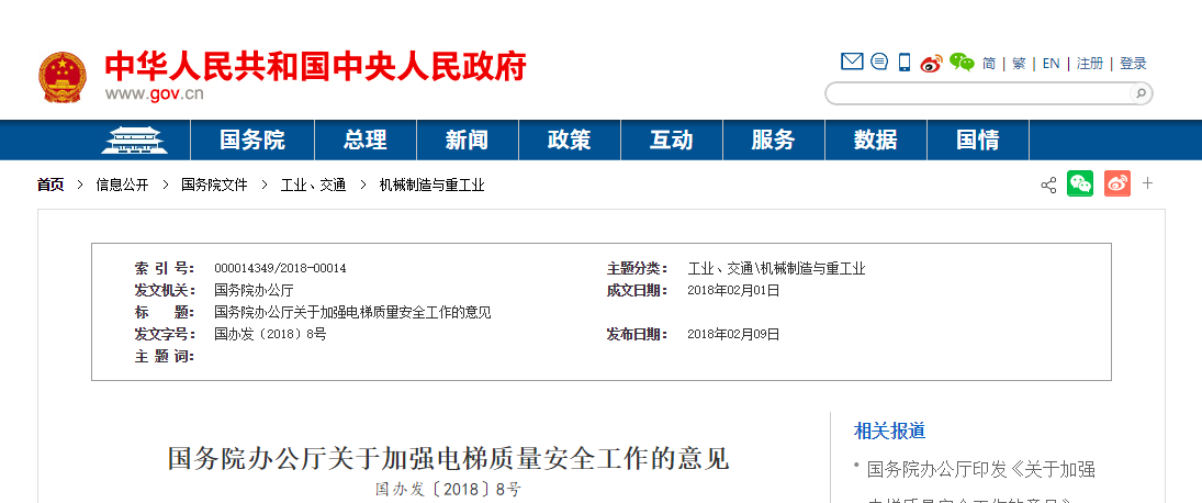 国务院办公厅关于加强电梯质量安全工作的意见 国办发〔2018〕8号各省、自治区、直辖市人民政府,国务院各部委、各直属机构:我国是电梯生产和使用大国。电梯质量安…2018/2/9 12:49:28 次浏览 -