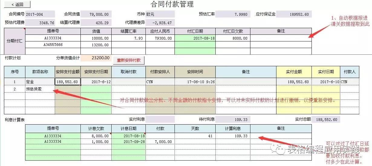 3、若超过付汇日期延期付款的,则需要计付利息,则可以通过此处的利息计算表进行测算,然后,在付款安排表中进行安排,对财务发出支付指令;