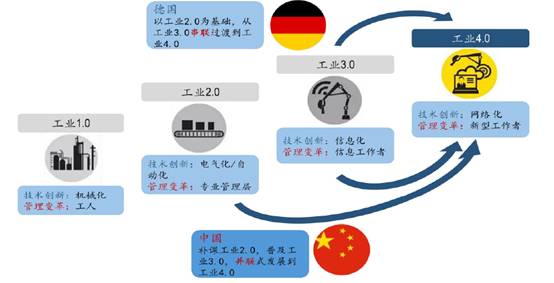 与德国等发达国家拥有雄厚的工业基础不同,我国工业基础较为薄弱,很多制造企业甚至还没有达到工业2.0的级别,不可能直接跨越到工业4.0。因此,中国智能制造必须走工业2.0补课、工业3.0普及和工业4.0示范的并联式发展道路,同时发展工业电气化、自动化和信息化。