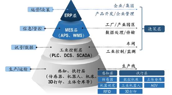 智能设备P大多处于智能制造系统的感知层、执行层,决策层主要完成C的职能,通过MES实现厂内生产制造信息化集成、通过EPR、SCM、CRM等实现企业级、产业链级价值链信息化集成。