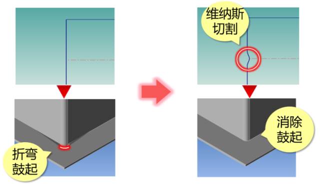 或者当检测到有些板材在折弯后,折弯边需要焊接时,板材的折弯鼓起就会影响到焊接品质。这时系统就会自动进行“维纳斯切割”处理,在折弯线部分根据板材特性自动切割一个凹陷,保证折弯鼓起后正好与边平行,以此提高焊接的效率和品质;
