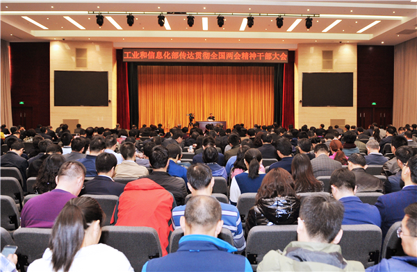 2017年3月16日,工业和信息化部召开干部大会,传达学习和贯彻全国“两会”精神。工业和信息化部党组书记、部长苗圩同志代表部党组传达会议精神并提出贯彻落实要求。部党组成员、总工程师、近期退出班子的部领导、部机关副处级以上干部、在京部属单位和部属高校领导班子成员约500人参加了会议。
