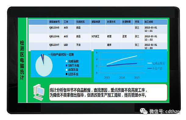 MES(Manufacturing Execution System)即制造企业生产过程执行系统,是一套面向制造企业车间执行层的生产信息化管理系统。MES 可以为企业提供包括制造数据管理、计划排程管理、生产调度管理、库存管理、质量管理、人力资源管理、工作中心/设备管理、工具工装管理、采购管理、成本管理、项目看板管理、生产过程控制、底层数据集成分析、上层数据集成分解等管理模块,为企业打造一个扎实、可靠、全面、可行的制造协同管理平台。在每条产线上挂装21.5英寸显示终端,高清显示,带触摸功能,提供POE供电,达到安装方便和美观的效果。管理层通过电脑可实时掌控物料、人员配置、生产情况,屏幕还可显示时间、天气等。