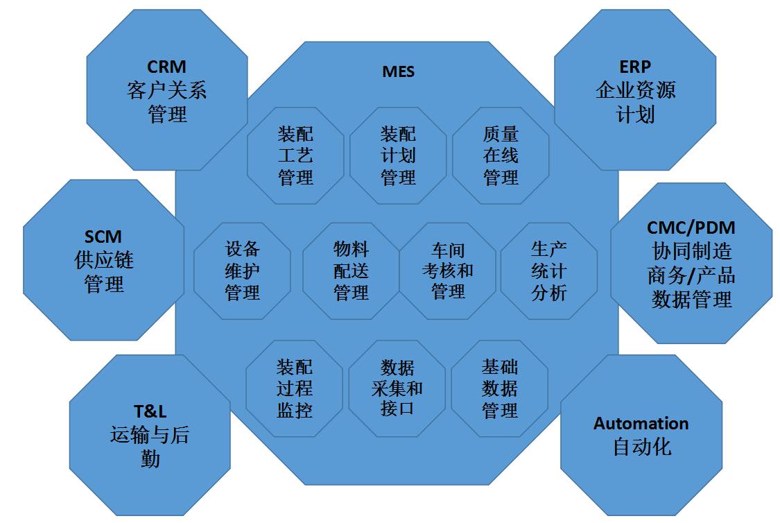 MES主要有以下几大功能,与企业的其它各个系统之间的关系如下图所示。