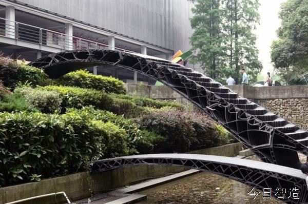 日前上海同济大学建筑与城市规划学院用塑料制造出中国的首两座3D打印人行桥,长分别为4米和11米。它们被安放在学校入口附近。11米长的桥横跨一条小溪和一个花园区域,有台阶;4米的则只架在水面上,是平坦的。