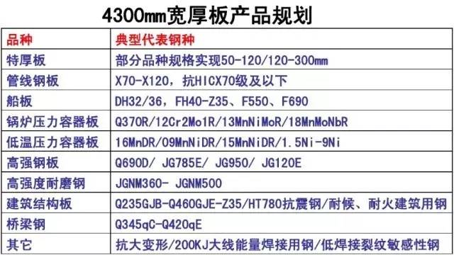 主要品种:低合金高强度结构钢板、管线钢板、油罐钢板、高强度船板、高等级锅炉压力容器钢板、桥梁钢板、耐候钢板、海洋平台用钢板、高层建筑结构用钢板及高表面质量要求钢板;产品的规格:(6~300)mm×(1500~4100) mm×(18000~52000) mm。