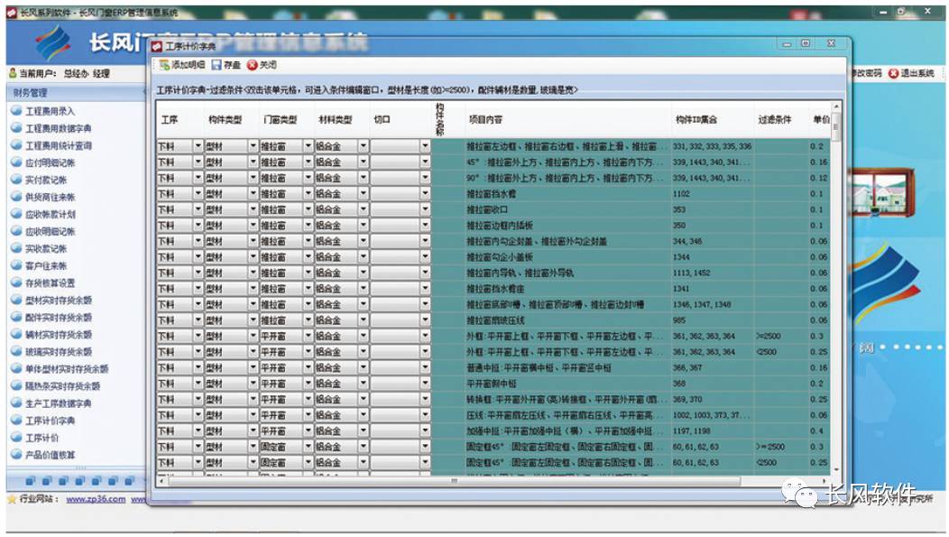 ③生产工序计价:系统满足不同生产计价需要,用户可灵活设置型材、配件、辅材、玻璃、框、扇的下料、加工、铣削、装配、组装各工序的计价标准,系统根据用户自定的计价标准自动计算生产加工费;支持工序用户自定义。