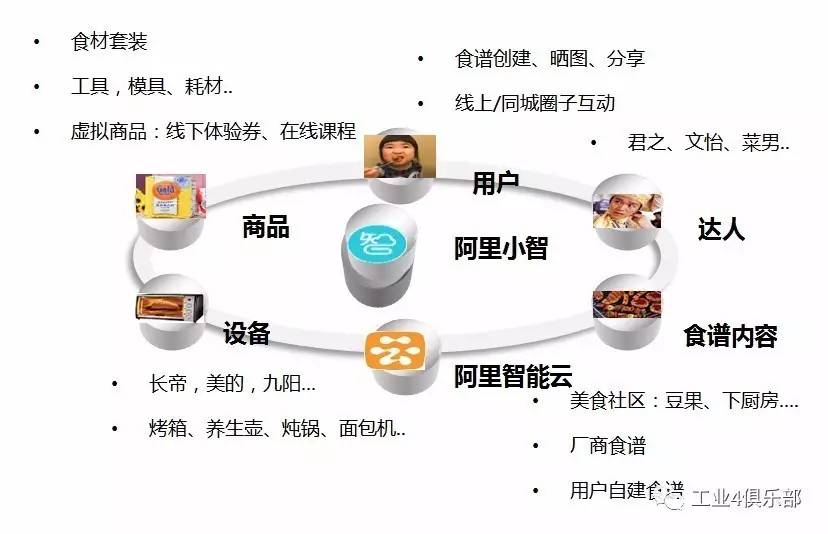 如图2所示,美的集团与阿里智能生活合作,在短短一个月内即完成了电烤箱、微波炉、电饭煲、压力锅等核心品类的“智能化”全面升级接入,形成了以“阿里小智”为核心,阿里智能云为架构基础的,包括用户、商品、设备、食谱、达人的全厨房设备、广用户联接的厨房生态。云食谱所传递的“一键智能烹饪”理念,得到了移动互联网时代“原住民”80后、90后消费者的普遍欢迎。很多消费者在积极尝新体验后,与其他用户在食谱讨论区中热烈讨论和交流,并与厂商的美食专家在线互动,学习美食制作中的小窍门。云食谱的一键制作新功能,也带来了用户的口碑传播和二次购买。