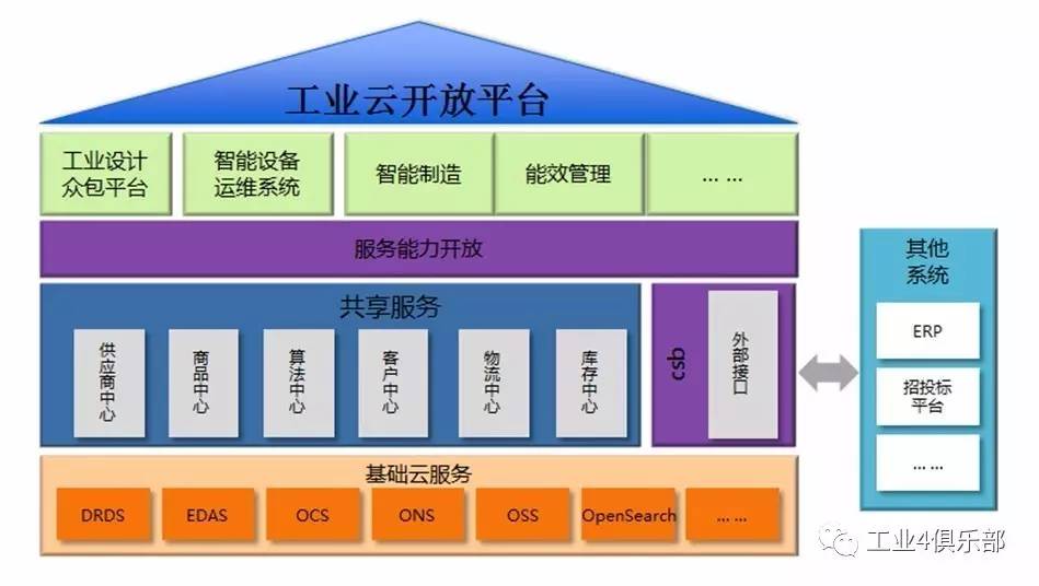 徐州重工集团与阿里云合作,部署在阿里云之上的“徐工云平台”,采用了云计算、大数据等技术,基于阿里云平台的开发技术规范,具有“平台化、可配置、多语言、高并发、高扩展性”的特点,可接纳全球用户的访问及在线互动。徐工云平台实现了基于“云技术”的全球开放共享,是云平台的典型案例。如图6所示,是工业云实施框架的一个示例。