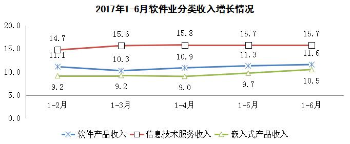 嵌入式系统软件收入增速稳步回升。上半年,嵌入式系统软件实现收入3957亿元,同比增长10.5%,增速同比回落7.3个百分点,但比一季度提高1.3个百分点。其中,5、6两个月增速连续回升,分别比上月提高4.1和1.1个百分点。