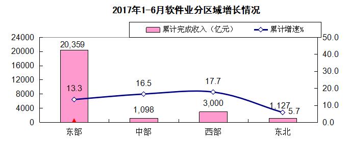 东部及东北地区增速低于全国平均水平,西部地区保持较快增长。上半年,东部地区完成软件业务收入20359亿元,占全国软件业务收入79.6%,同比增长13.3%,增速同比回落2.1个百分点,低于全国平均水平0.3个百分点;西部地区完成软件业务收入3000亿元,占全国软件业务收入的11.7%,增长17.7%,增速同比提高0.4个百分点,比一季度提高0.1个百分点;中部地区完成软件业务收入1098亿元,占全国软件业务收入的4.3%,增长16.5%,增速同比回落2.8个百分点,比一季度下降1.9个百分点;东北三省完成软件业务收入1127亿元,占全国软件业务收入的4.4%,增长5.7%,增速同比提高0.5个百分点,比一季度提高1个百分点。