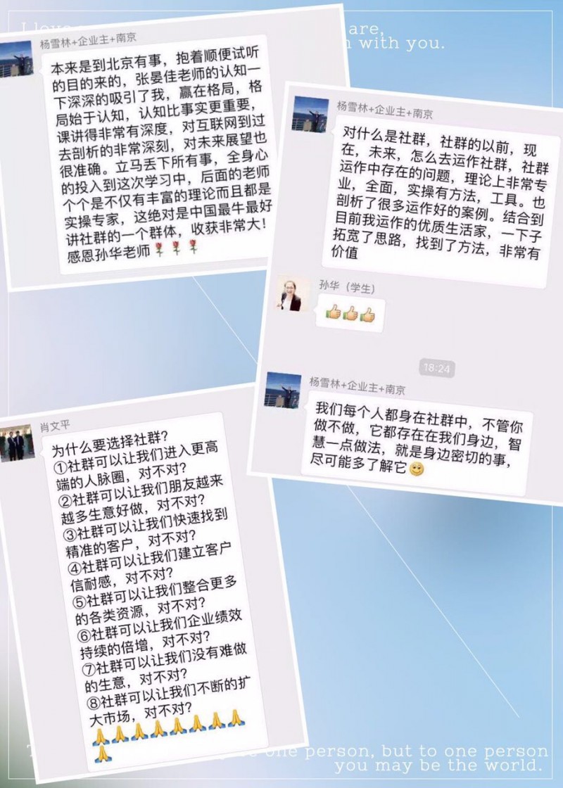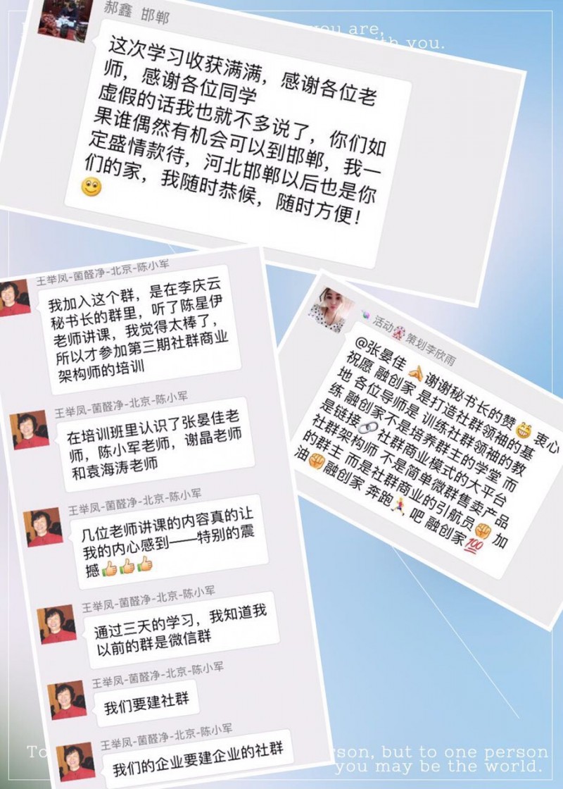 作为一名社群行业的从业者,知名社群发群人,我听过全国大大小小社群的培训,更是时刻关注全国各地的社群发展动态。自从上了第一期后,马上决定成为中国社群领袖俱乐部的联合发起人,因为这里的讲师团队是最实战,最专业的,课程是最系统,最了解中国社群商业的,比凑拢的课程不知好了多少倍,所以,我决定深度关注与跟随,并成为预备讲师和各位导师们一起去全国为传统中小型企业转型升级传道解惑,让传统企业家告别烧钱的广告和营销,用社群来运营用户快速变现。by 魏章川