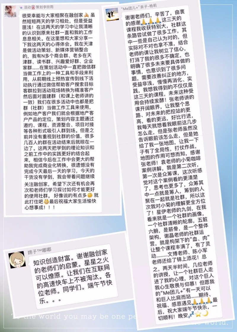融创家只是为了找到好项目、好资源、好人才,培训结束后有45天的陪伴学习,每周线上分享、线下沙龙、线上课程、各种项目对接、企业走访、脑图案例、私董会、社群内参等,这一切都是为了真正能帮助传统中小型企业通过社群来实现转型升级,2017年目标:孵化100个优质社群。