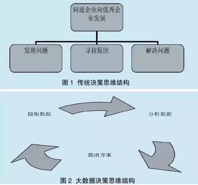 在大数据时代,决策观念的转变主要是思维方式的转变,从传统的因果关系转变为相关关系。传统的因果关系的决策方式是通过发现企业发展中出现的问题,找到企业出现问题的症结所在,并针对产生问题的因素进行整顿,从而解决企业发展中的问题,使得企业由问题企业向优秀企业进行转变。这种从问题找原因的思维方式属于逆向思维,而大数据时代的决策思维则是正向思维,所谓的正向思维则是不追寻因果关系,而是寻找相关关系。正向思维首先是要对大数据进行搜集,然后对于大数据进行量化分析,找到相关关系,提出优化方案,从而使得企业得到发展,从优秀企业转向卓越企业,如图1和图2所示。