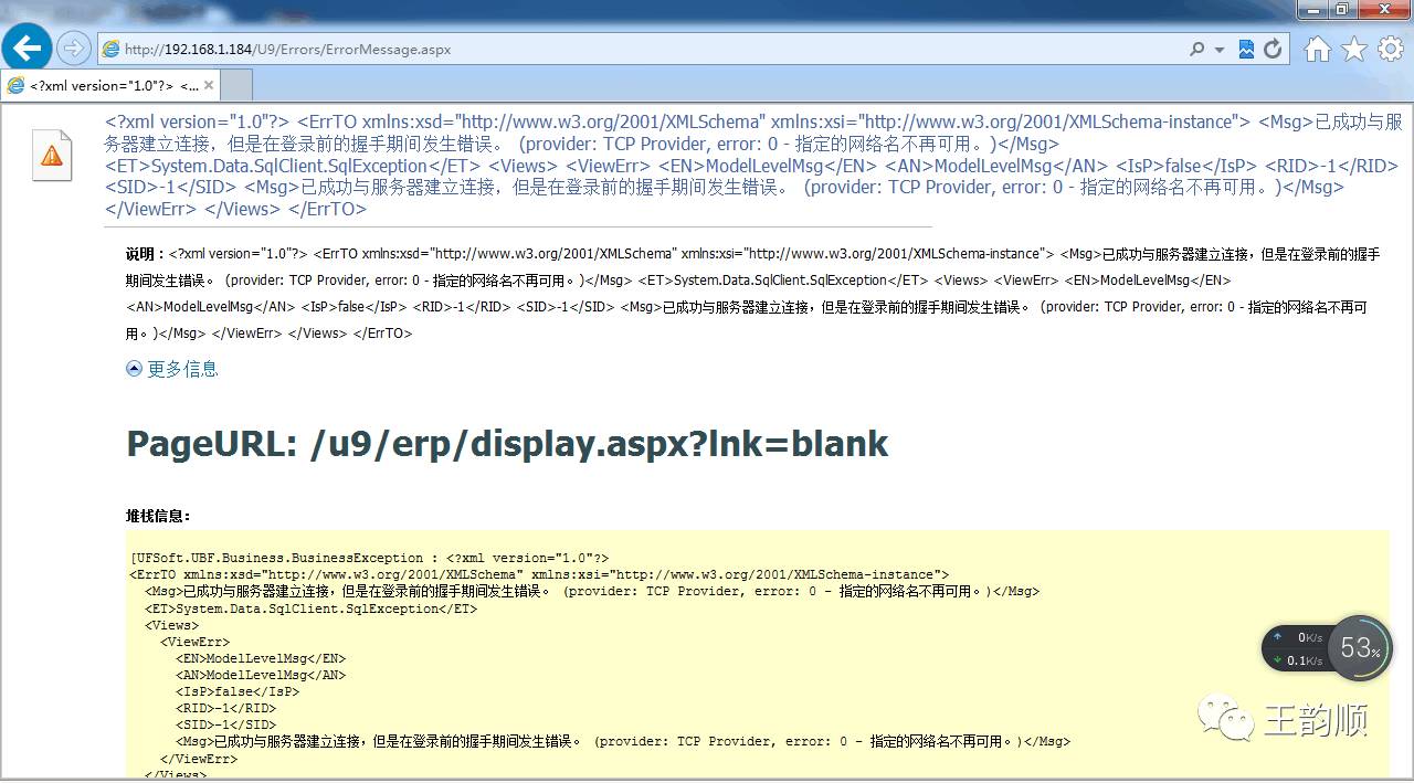 服务的一家公司ERP系统用的是用友的U9,U9是用友B/S架构的面向集团化用户的一款ERP产品。系统无法正常使用,具体报错为
