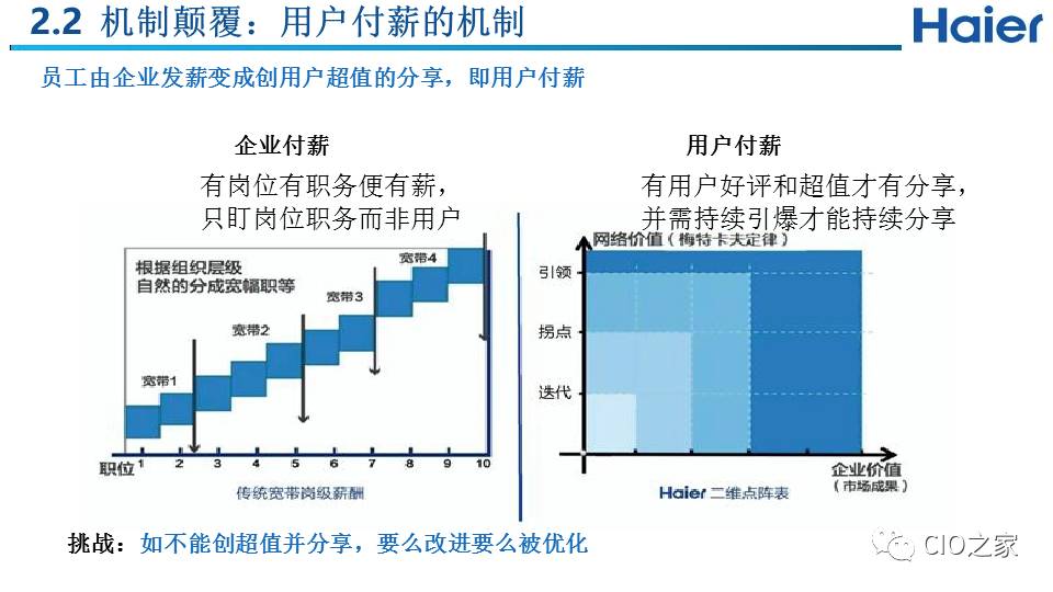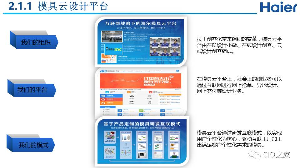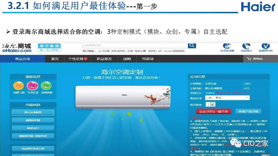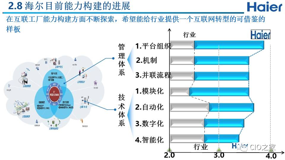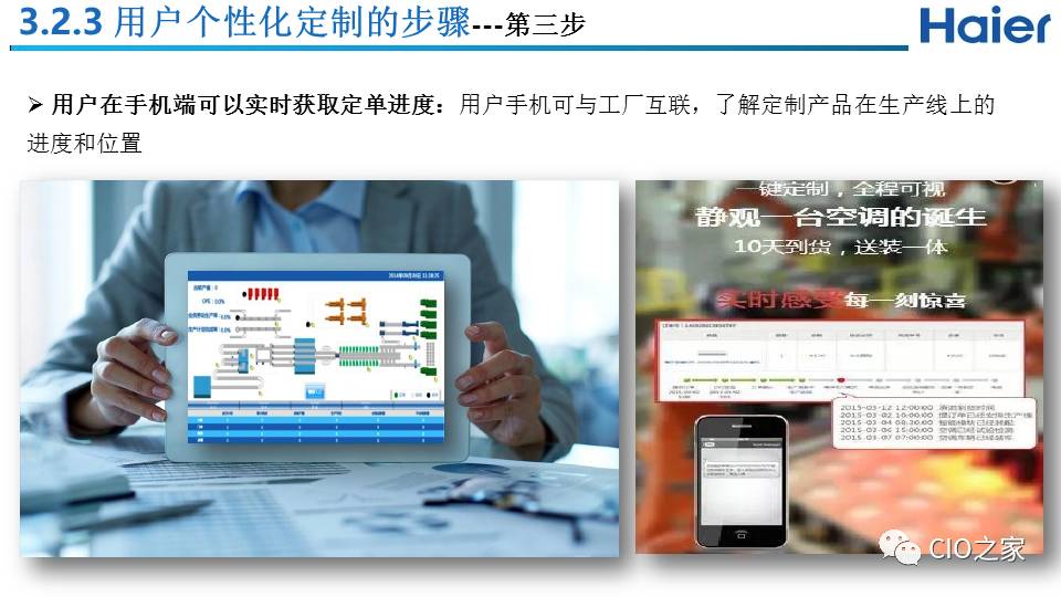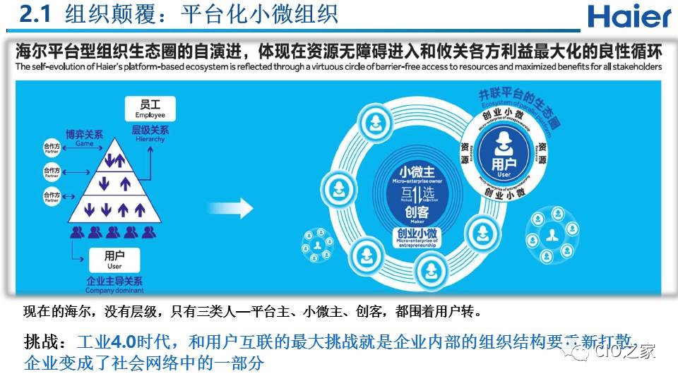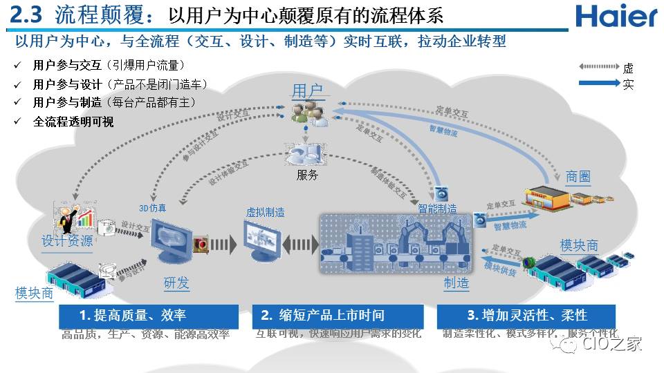 我们从两个维度具体实施,也叫做“两维战略”:纵轴是指的是用户价值,也就是通过互联工厂来实现的用户个性化定制价值:通过和用户交互建立起用户圈,同时和所有利益攸关方(包括设计资源、模块商等)建立起生态圈,共同满足用户个性化需求,实现用户价值。
