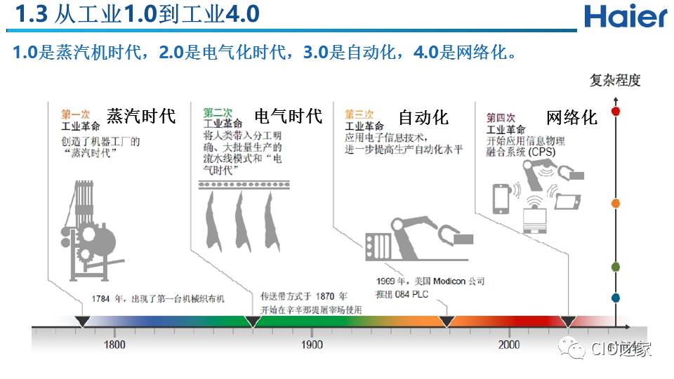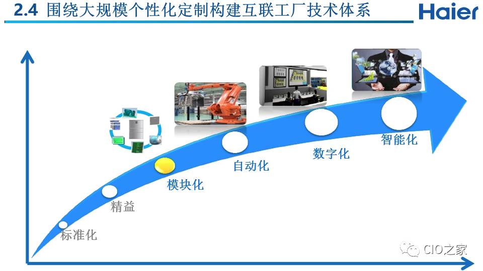 横轴是对企业模式能力的升级,通过模块化、自动化、网络化、数字化和智能化,提高企业满足个性化需求的能力,即柔性制造能力,包括从底层的传感器、网络布局到物物互联、人机互联,一直到企业的信息系统、智能决策系统的实时互联,最终实现企业的高效益。