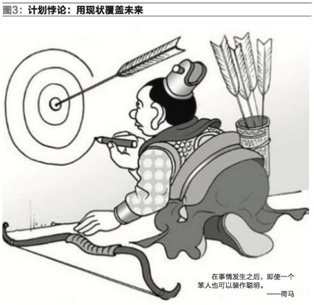 现实中,绝大部分计划的依据都是实际产能,于是出现了一个悖论:用现有的实际产能来作为未来的计划依据,而这个实际产能又可能是综合了各种变数和差异导致的最终结果。也就是说,这个产能数据可能是体系提供的一个“谎言”——相当于先射箭到白板上,再以箭头落脚点为圆心画一个园,于是永远是十环!所以评价体系也被歪曲了。因此,当我们不知道产能和生产计划的数据的逻辑关系时,我们容易“用现状覆盖未来”,如图3。