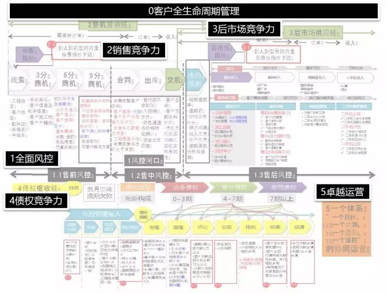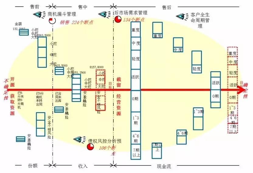 通过对销售流程的224个变量、售后市场的134个变量、债权风控的106个变量的全方位检测,项目团队发现销售系统、库管服务、服务系统、债权系统等24套系统数据形成了信息孤岛,近4万台工程机车信息被淹没,而且缺乏基于GPS行为价值数据的客户分群。基于详细的分析、筛查与诊断,最终项目团队定位了5大核心出血点,包括: