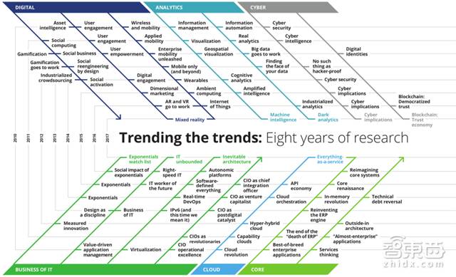 德勤的这份技术趋势报告主要围绕信息技术转化(IT unbounded)、数据分析(Dark analytics)、机器智能(Machine intelligence)、混合现实(Mixed reality)、面向云的开源架构(Inevitable architecture)、现代化服务(Everything-as-a-service)和区块链(Blockchain: Trust economy)七大主题展开分析,并盘点了科技界新兴的,有机会转化为产业动力的热点。