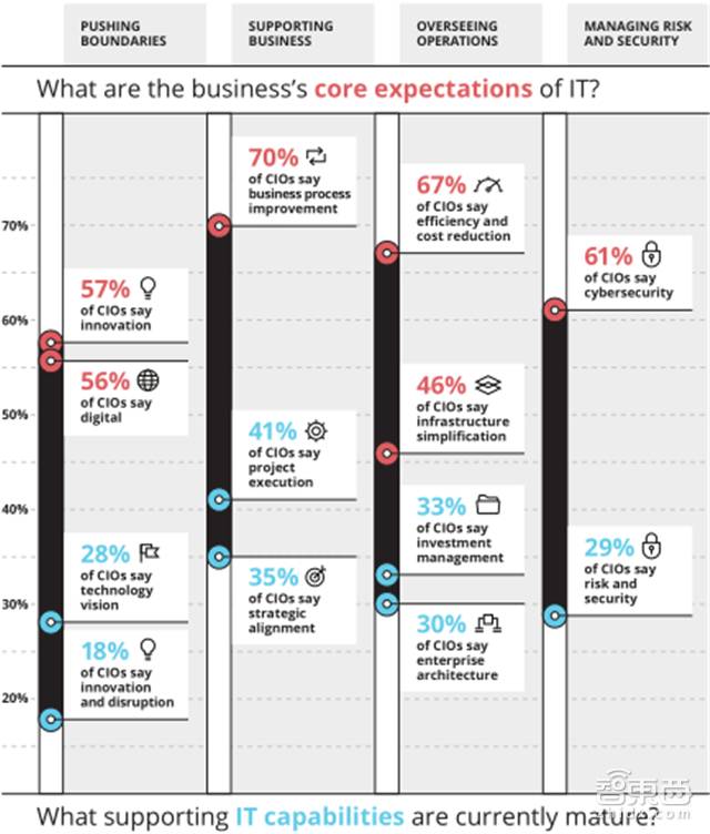 对于IT技术官们来说,他们的视野需要超脱本身的经验专业限制,用一种全新的角度来布局运营和战略,加速现有的IT部门向基于云的信息技术转化服务(Cloud-based SaaS)升级,并与开发和运营(DevOps)一同优化企业驱动的各种资源,引进机器人过程自动化、认知自动化、智能自动化等,鼓励工程师开源项目。他们应该想办法简化开发和测试过程,取代冗杂的传统手段,发挥信息技术的高效性,加强部门/工程师之间的联动性。