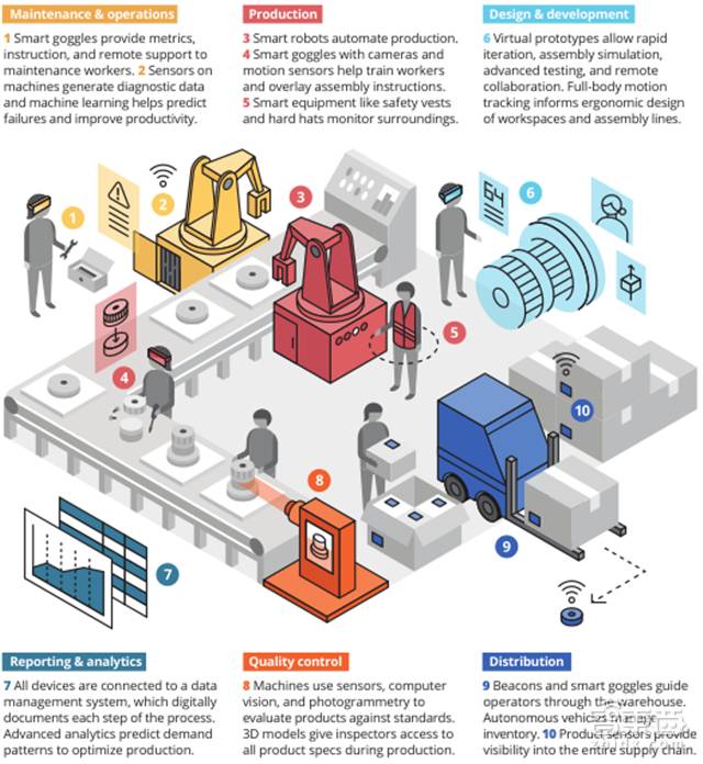 与此同时,物联网概念的兴起也为MR的产业链(平台、设备和软件生态系统),特别是底层传感器,提供了有利环境。物联网与MR合作的用例有,将MR集成到制造环境中,从车间入手改善制造流程。通过数字技术的更新实时信息,工厂可以减少工人暂停和机器空转期。。