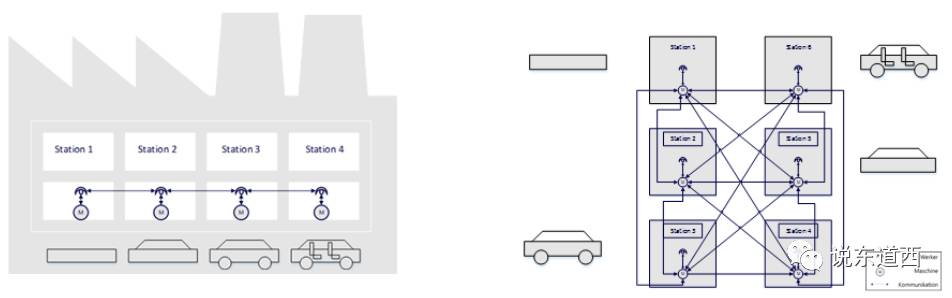 在德国VDI和ASME共同的研究报告中对未来的工厂制造模式改变进行了阐述,如图2,通信与互联在未来的汽车工厂呈网络状连接,这会影响组织的架构、技术的实现、生产运营管理各个环节,因此,工业4.0带来的复杂性是必须予以考虑的,构建什么样的团队协同、个体能力升级都是未来智能制造所必须予以重视的问题。因此,很多人想简单了,就是把现在的人重新组织,但是,这个类似于多智能体、复杂交互的系统对人的要求本身也是高智能体作为前提的。