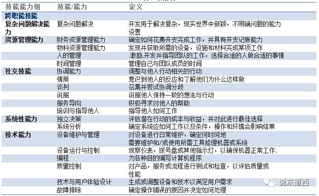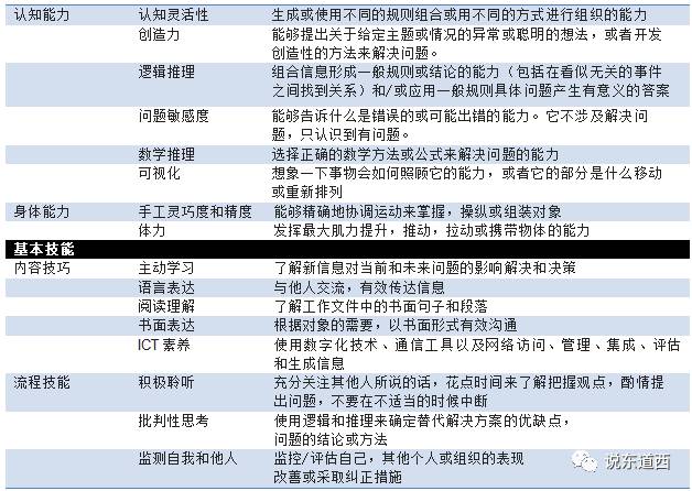 在世界经济论坛这份报告中,同时也结合美国劳工部的O*NET(Occupational Information Network)研究,对劳动者核心能力进行了定义,参考表1-2。