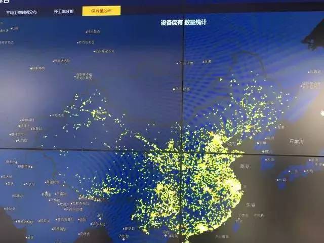这是通过工业物联网大数据平台,利用可视化技术展现的全国工程机械设备保有量的分布图,包括混凝土机、挖掘机、汽车起重机、道路机械、桩工机械等各类设备。图上的每一个小黄点就代表一台接入设备,黄点越密集的地方,就说明这里的工程机械设备越多。