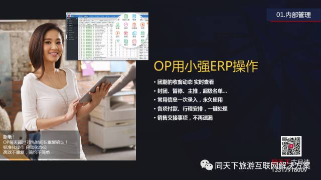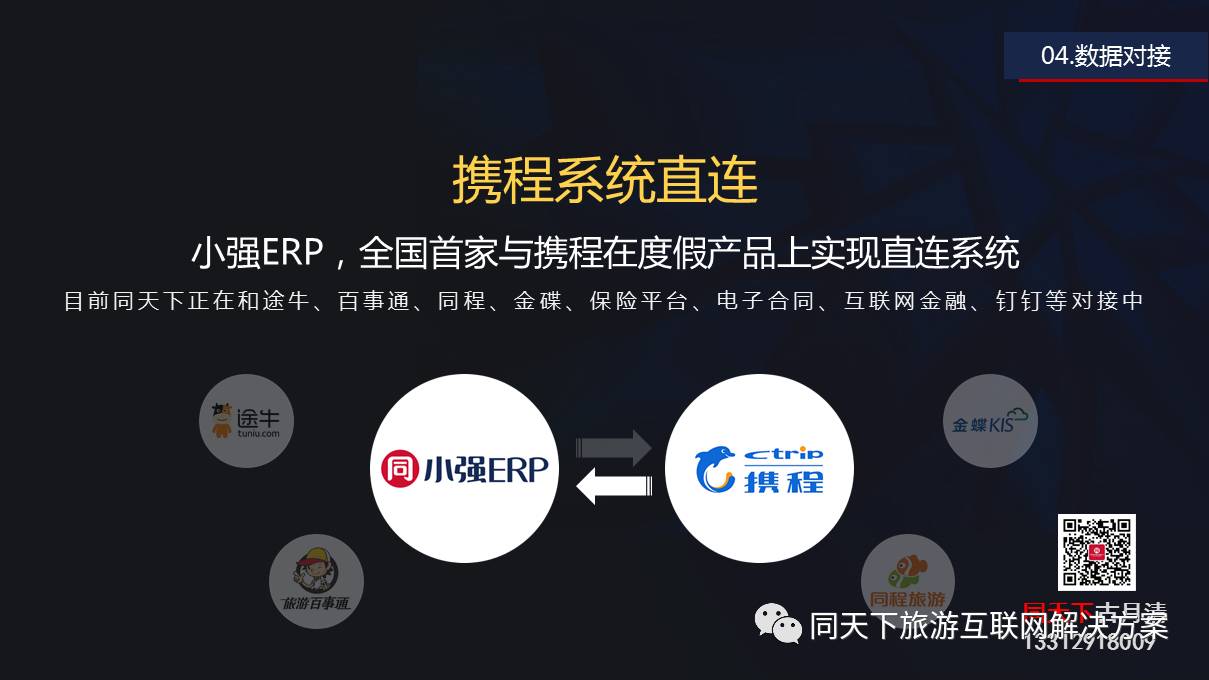 寄语:“使用小强ERP系统办公,能随时随地查位、收客、分销等,操作各项安排一键处理,财务报表自动生成,所有产品还可直接对接到携程系统上,且不用人工对接。以前3人的工作量现在1人就能完成,省时省心。”