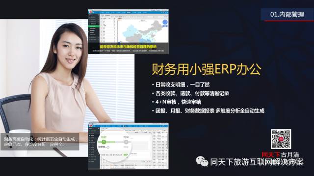 寄语:“小强ERP的数据统计功能很强大,将整个公司的业务划分的很清晰,且对市场走势、销售业绩、游客统计等均有详细数据实时分析,对我们进行市场决策给予了有力支撑。”