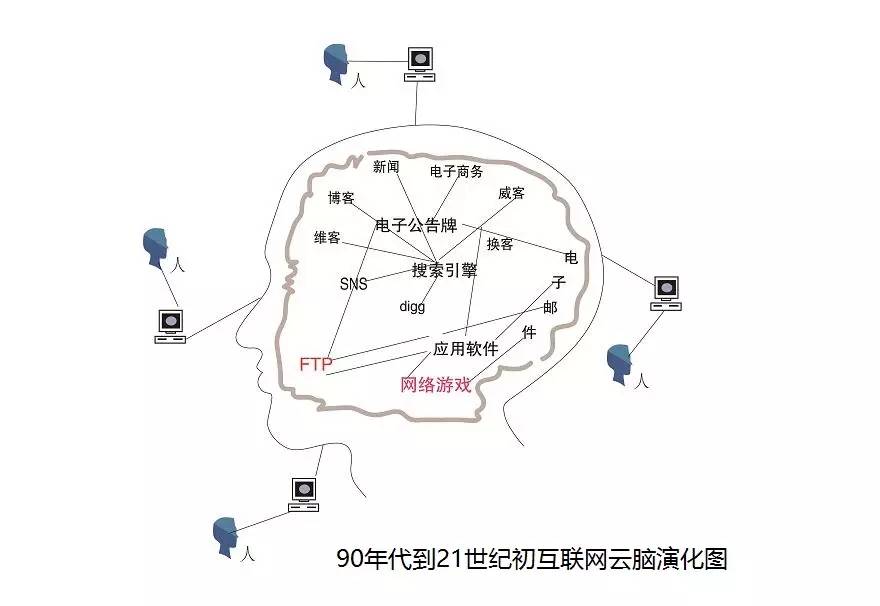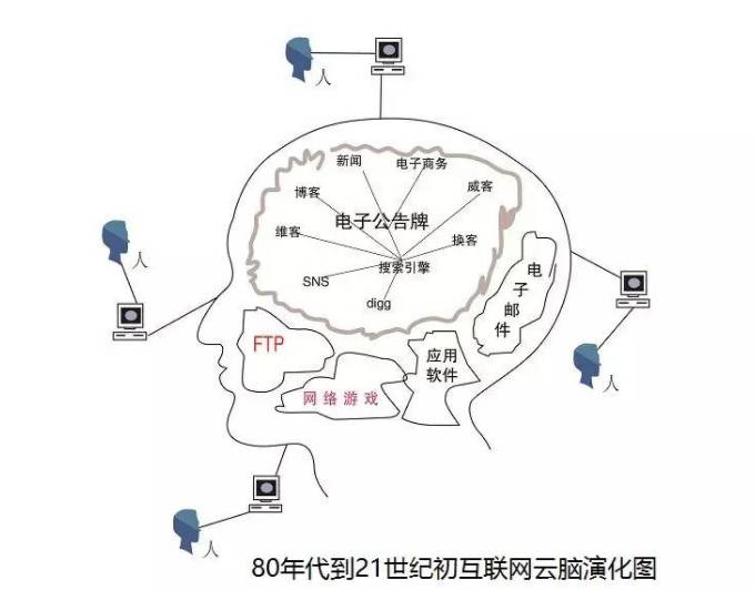 互联网云脑进化示意图图六:从21世纪前十年,电子公告牌及其分离的功能区开始和电子信箱,FTP,网络游戏,网络应用软件进行融合。