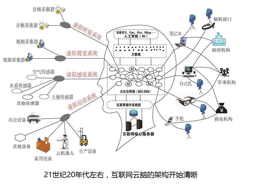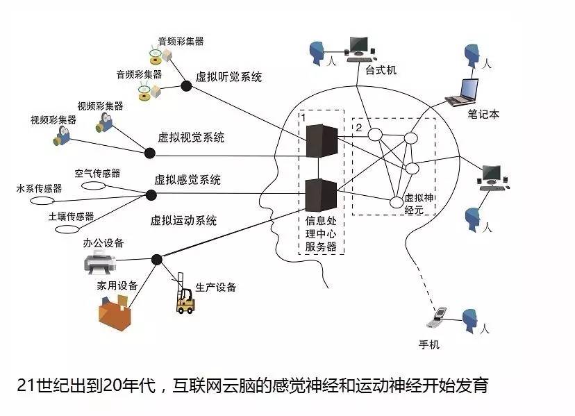 互联网云脑进化示意图图八:从2007年开始,随着智慧地球,物联网,工业互联网,工业4.0,智能汽车,无人飞机,云机器人等技术的兴起,互联网云脑的感觉神经系统,运动神经系统也开始发育起来。