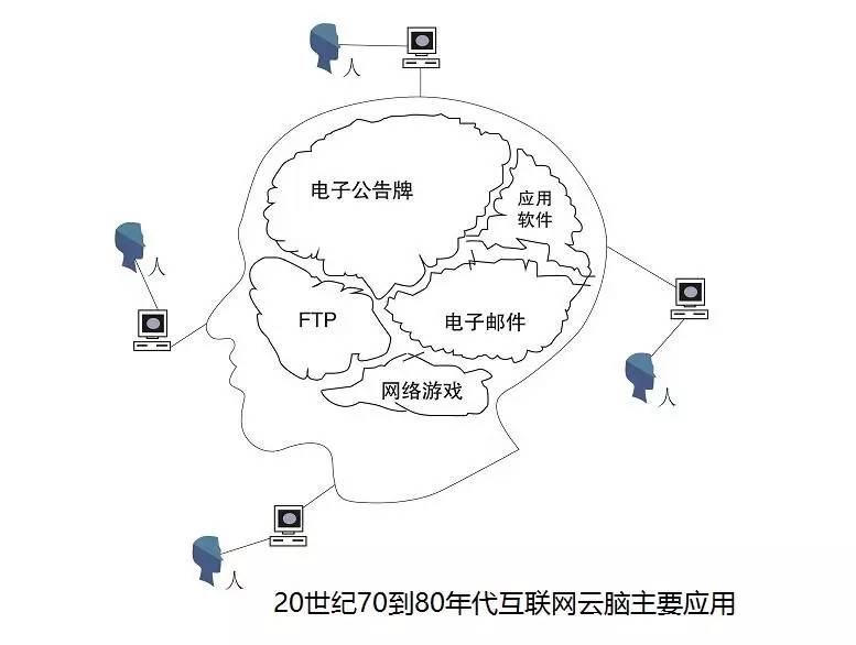 互联网云脑进化示意图图四:70年代到80年代初,互联网云脑初具雏形,拥有电子公告牌,电子邮箱,FTP,原始游戏,网络应用软件五大功能。