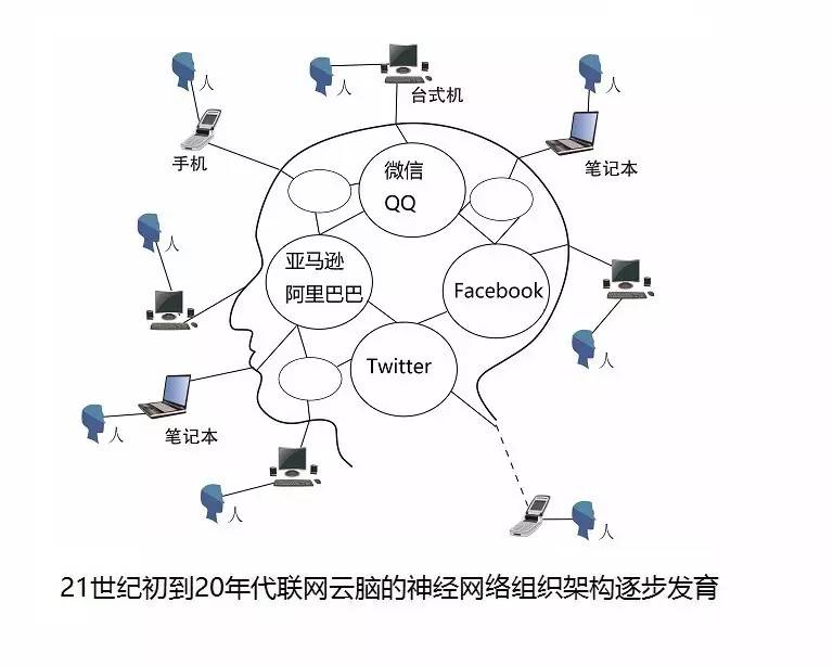 互联网云脑进化示意图图七:从21世纪初到21世纪20年,博客,QQ,Facebook,微信,twitter,阿里巴巴,亚马逊等互联网神经网络形态的应用逐步发展壮大,成为互联网云脑神经网络的基础,这部分应用逐步在互联网云脑中占据统治地位。