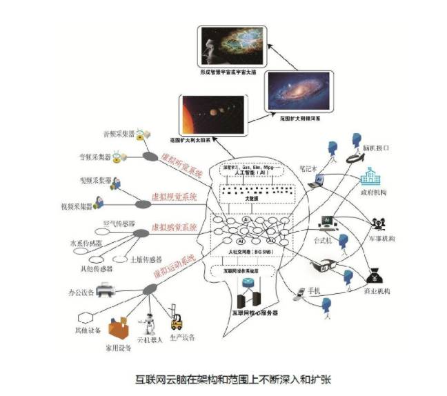 互联网云脑进化示意图图十:2020年之后的数十年,数百年间,以大社交网络为主体的人类群体智慧,和以云反射弧为代表的互联网云脑智能活动,将成为互联网云脑发育的主要方向。于此同时,互联网云脑的感觉神经系统,运动神经系统,神经末梢将伴随人类在太空的拓展而延伸。从地球到太阳系,从银河系到宇宙深处,在足够的时间段之后,互联网、大脑和宇宙将最终三位一体,形成智慧宇宙或宇宙大脑。