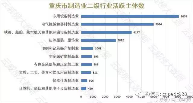 重庆制造业二级行业分布“专用设备制造业”以8076高居榜首。值得注意的是:重庆两大支柱型制造业,计算机通信和电子设备制造业、汽车制造业分别以420和125位于10、13位,工商活跃主体数远低于前十的其他行业。究其原因主要是:重庆的电子制造业和汽车制造业的公司大都属国际性大型企业,虽然数量少,但产能大,形成了产业化规模化发展,已初步形成技术密集型生产格局。