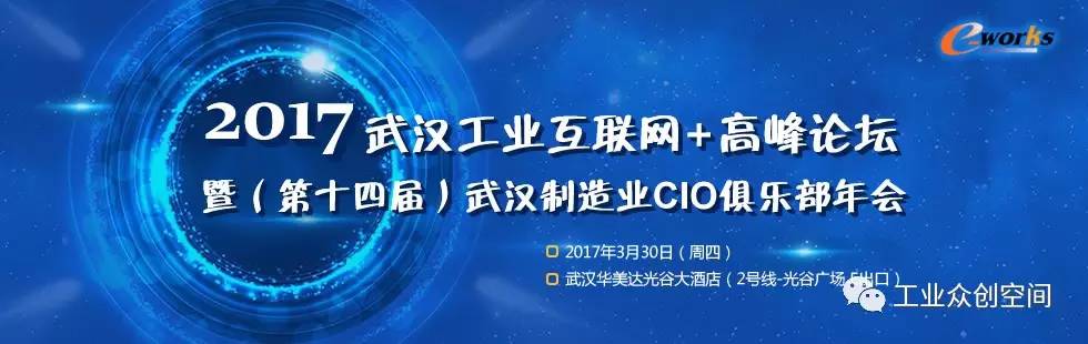 尊敬的女士/先生:e-works诚挚邀请您出席于2017年3月30日举行的“2017武汉工业互联网+高峰论坛暨(第十四届)武汉制造业CIO俱乐部年会”。自2003年起,e-works每年初春时节都会举行武汉制造业CIO俱乐部年会,受到武汉制造企业的广泛欢迎,成为武汉制造业信息化高端人士一年一度的大聚会。每次年会,e-works黄培博士都会分析制造业两化融合应用现状,详细解读年度制造业及两化融合十大热点。2016年5月国务院印发了《关于深化制造业与互联网融合发展的指导意见》,明确提出了制造业与互联网深化融合发展的主要任务和目标。武汉市也出台了《武汉市关于实施“互联网+”产业创新工程的意见》。为了帮助武汉市制造企业推进“互联网+”工程,本届年会将重点探讨工业互联网技术、市场及应用案例。探讨内容包括:工厂无线应用、移动互联、移动营销、企业云计算、大数据应用等企业互联网+应用实践。下午参观《西门子工业众创空间》(武汉未来科技城)。诚挚邀请制造企业CIO及IT主管拨冗出席。