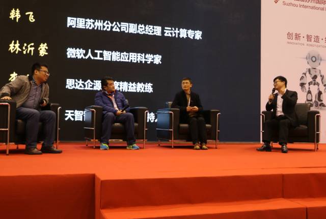 在智能制造专家分享出热腾腾的技术干货后,由天智智能董事长施正华主持了圆桌论坛”智能制造爆发期离我们还有多远“,阿里苏州分公司副总经理云计算专家韩飞、微软人工智能应用科学家林沂蒙、思达企源首席精益教练李余江参与了论坛,三位专家通过自身企业的工作经验,分别从云计算、人工智能、精益智造等方向为现场阐述了智能制造在各个领域应用中的落地问题和解决方案。