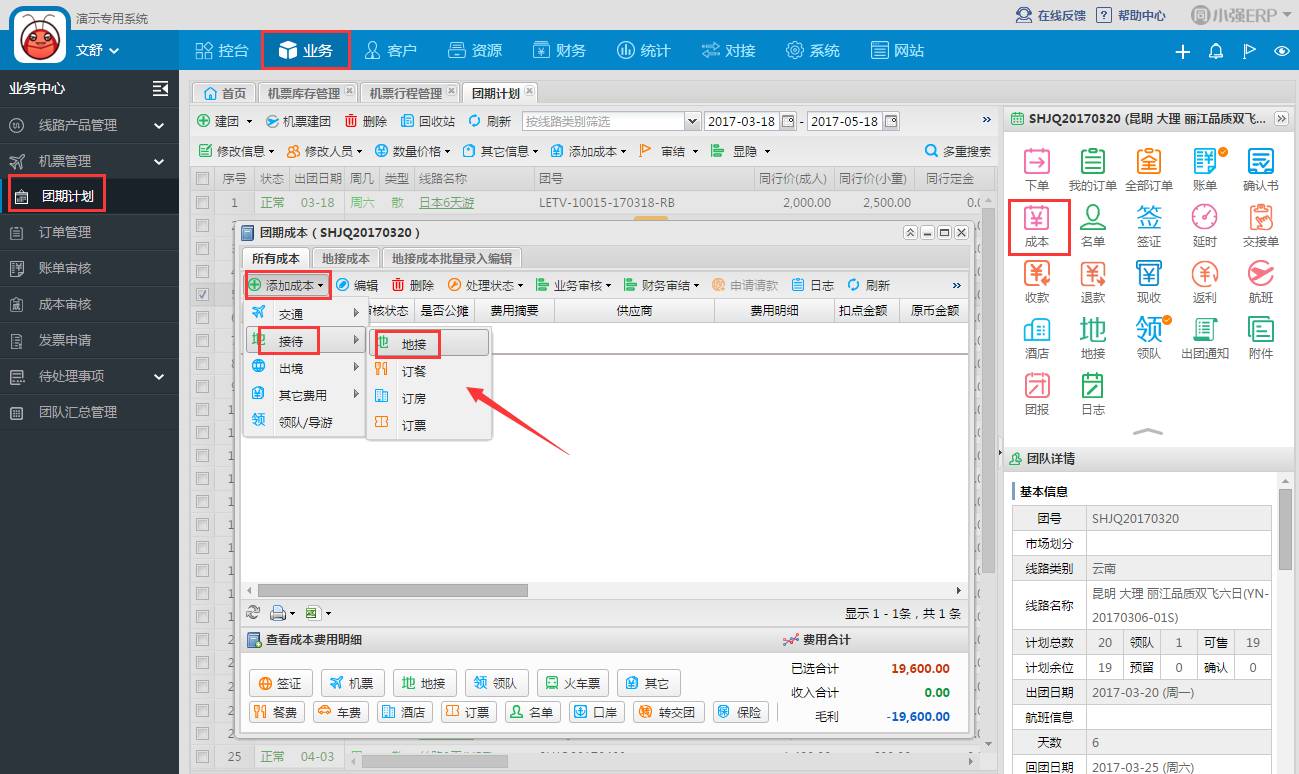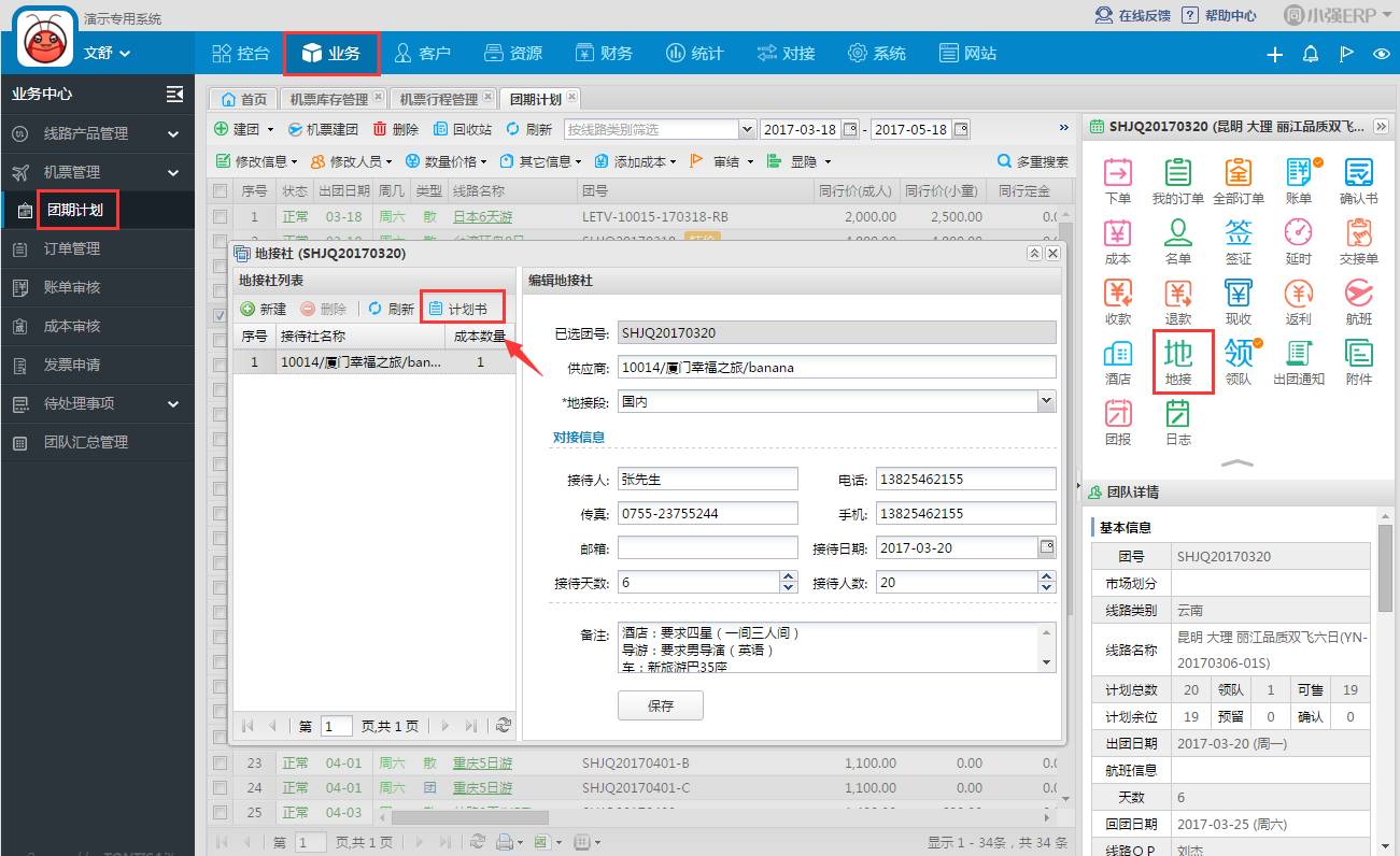 为了进一步提高组团社、供应商与地接的办公效率,小强ERP隆重上新地接计划书通用版,用户可根据团期录入地接、名单、出团通知书的相关信息同步导入到地接计划书中。这样则可确保双方交接信息无误且交接一步到位,为双方都节省了大量的时间成本。操作如下图:
