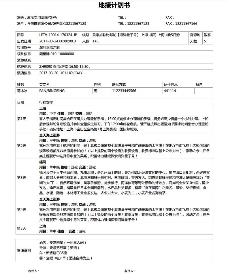 填写完后,点击计划书,系统即可自动统一在一个页面中带出该团的地接交接事项和具体行程安排,如下图:
