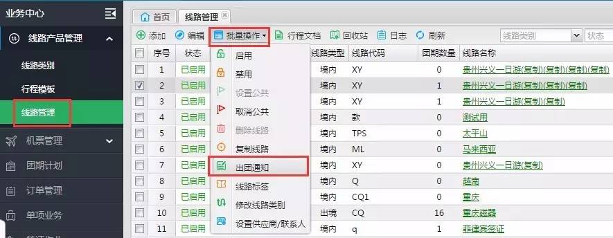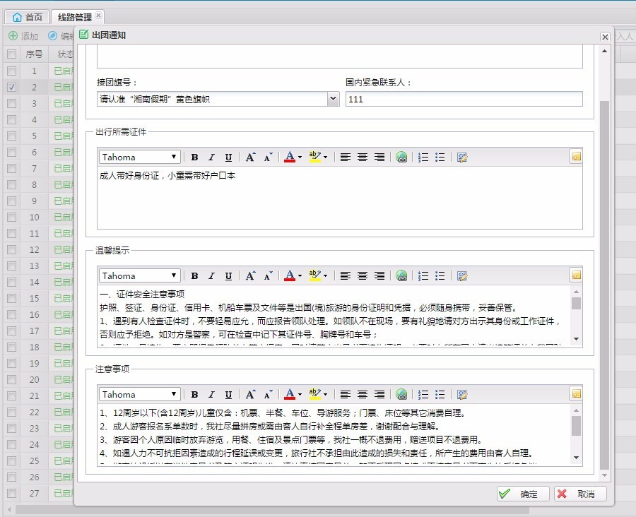 现在,线路管理新增出团通知功能了,你可以把经常用到的线路提前编辑好通用的出团通知信息,此后只要是涉及到该线路建团的团期,出团通知书会自动带入已编辑好的信息,大大节省了OP的工作时间。这又是个一劳永逸的功能哦。操作如下图: