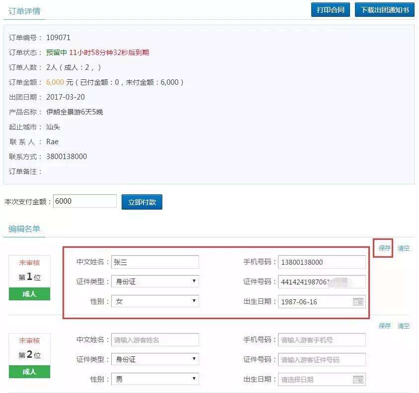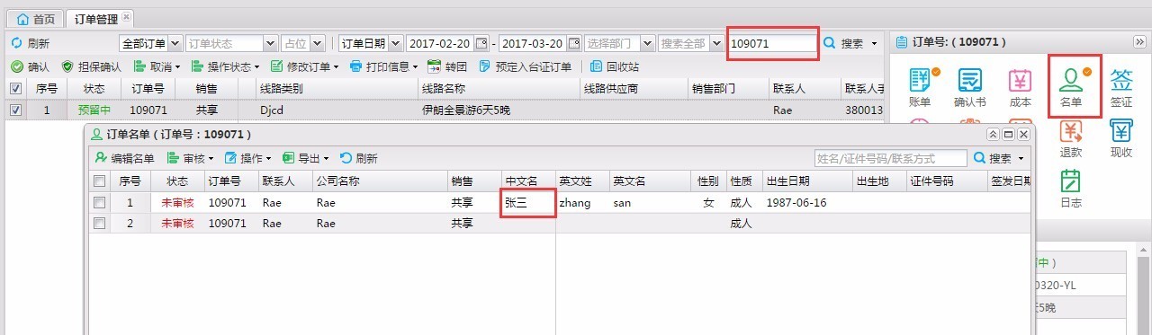 客户在前台网站订了位子,进入订单里面可以直接录入相关的名单信息,提交后旅行社人员可直接在系统后台进行名单审核,也不需要销售二次录入名单。