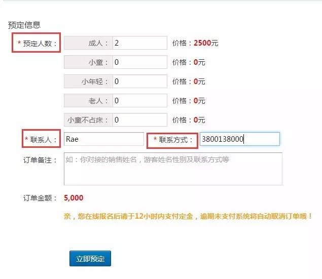 填写预定人数、联系人及联系方式等基本信息后,点击立即预定提交订单