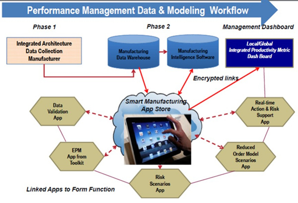 SMLC定义的智能制造通过云技术来储存无限量的数据,通过平板电脑、智能手机等无线设备对可用于制造、财务、库存管理等目的的应用程序(app)进行操作,可以应用于整个工厂,甚至覆盖供应商和客户的整个商业网络。