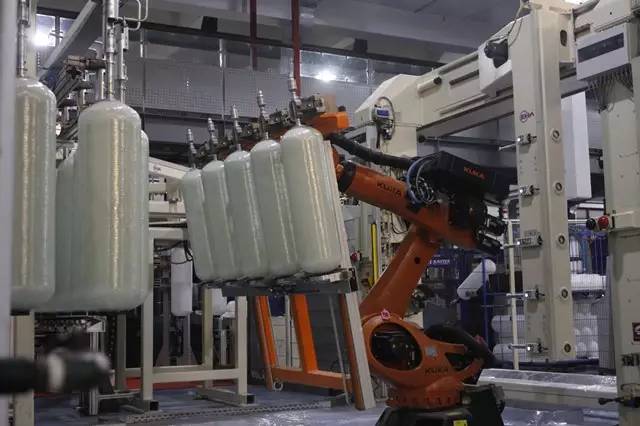 开能的第一条全自动化生产线,设计于2011年并于2013年正式运营,主要生产水处理核心部件——复合材料压力容器,这是一款广泛应用于居家、商业、大流量净水设备、软水设备中的重要部件。在KUKA机械手井然有序的工作下,从原材料下料,到吹塑、玻璃纤维缠绕、烘干、品质检测、打包、入库,实现了每60秒一个产品的高效产能。