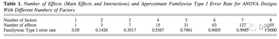 实验错误概率(Experimentwise error rate)是指在一个实验中所做的所有分析中有一个或者多个效应犯I类错误的概率。如果进行两个3因素方差分析,实验错误概率可能超过50%。也就是说14个主效应和交互作用中可能没有一个是真正的有意义的效应,我们仍然有接近50%的概率发现至少1个显著性假效应。