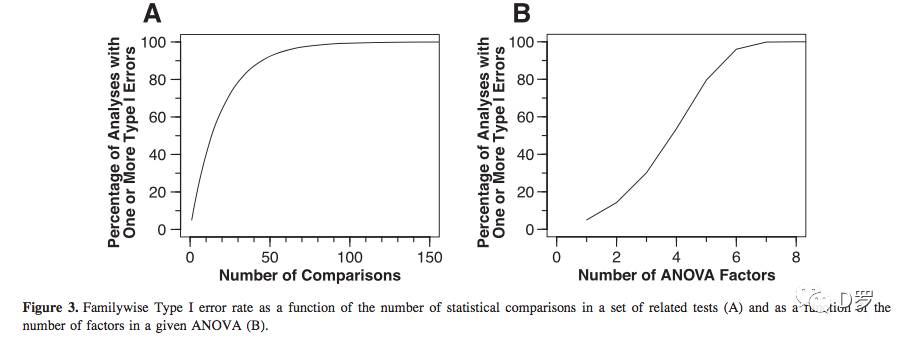 总体错误概率(Familywise error rate)是指在一组相关的分析中(比如单个ANOVA分析中得到的主效应和交互效应),一个或者多个效应犯I类错误的概率。比如,一个3因素ANOVA分析包含3个主效应,4个交互作用,可能会导致超过30%。