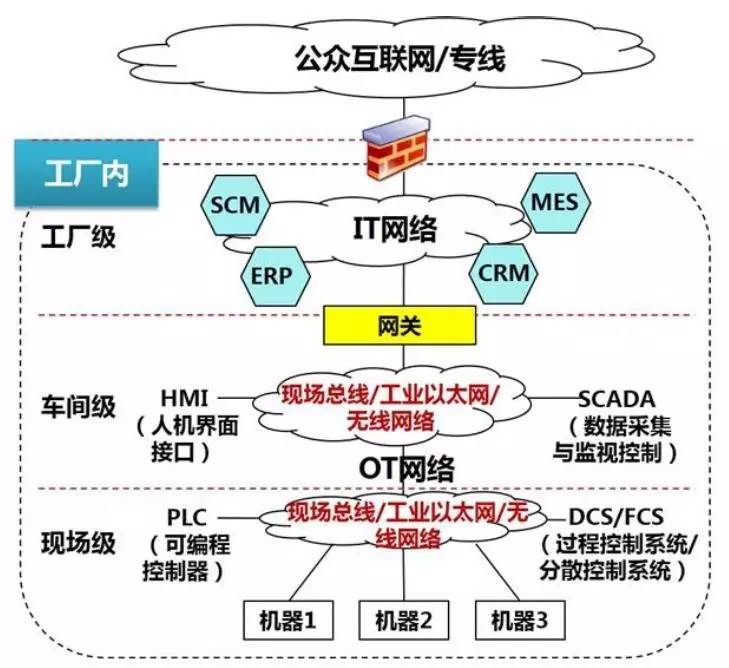 工厂内部网络呈现“两层三级”的结构,如下图所示。工厂内部网络面临的主要威胁:一是“两层三级”的网络结构导致工业控制网络与工厂信息网络的技术标准各异,传统的IT 安全防护技术难以实现安全的无缝覆盖;二是工厂网络配置动态化的发展趋势,对安全防护和追踪带来非常大的技术困难。